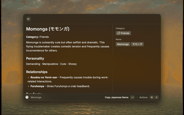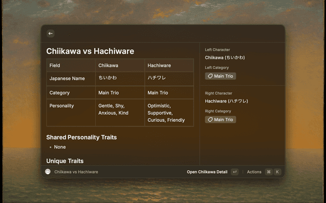 Raycast extension for searching and browsing Chiikawa character profiles offline. Character data and "open official page" actions use the official character pages.