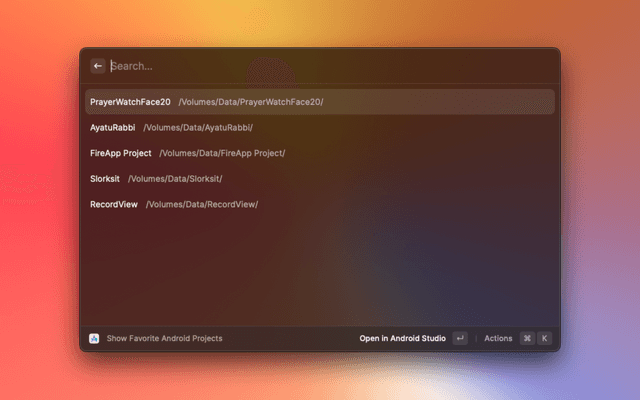 Open current Finder directory, selected folder in Android Studio, Add your favorite projects for quick access.