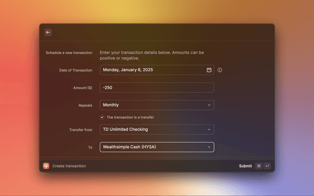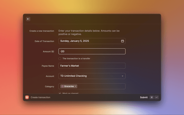 Edit Transaction (⌘ + ↵): Edit any of the provided transaction information: