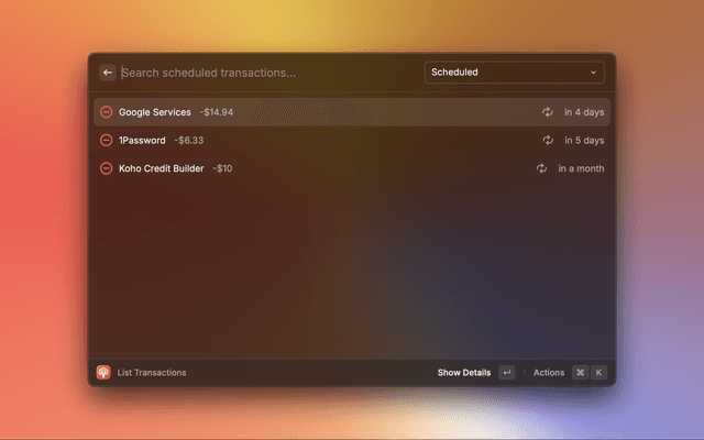 Show Related Transactions (⇧ + ⌘ + ↵): Take a peek at recent transactions on the selected category