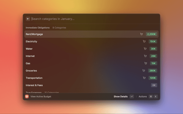 Show Monthly Budget (⌘ + ↵): Show additional information about the monthly budget