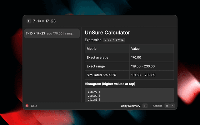 Lightweight probabilistic calculator that lets you type ranges (with `~`) and arithmetic to see exact bounds plus simulated outcomes and a text histogram.