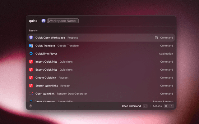 CLI-style quick launcher for instant access to any item across all your workspaces. Type to search and press Enter to open individual items without launching the entire workspace.