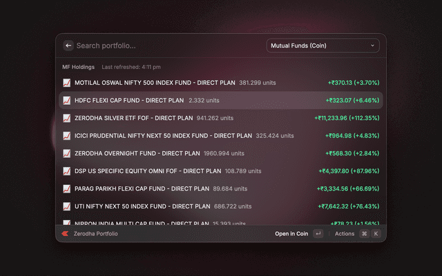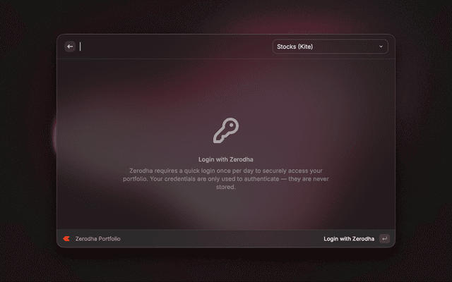 Open Raycast, search for "Zerodha Portfolio", and see your: