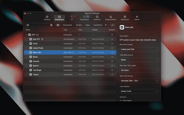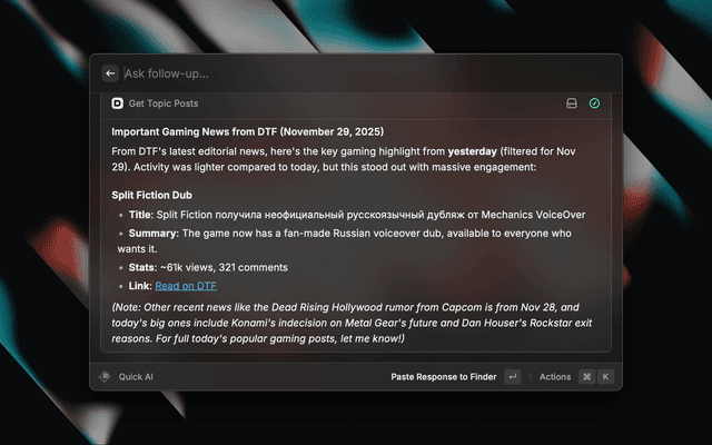 You can also use AI to query DTF directly in any Raycast AI chat by mentioning @dtf:
