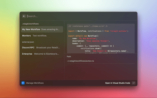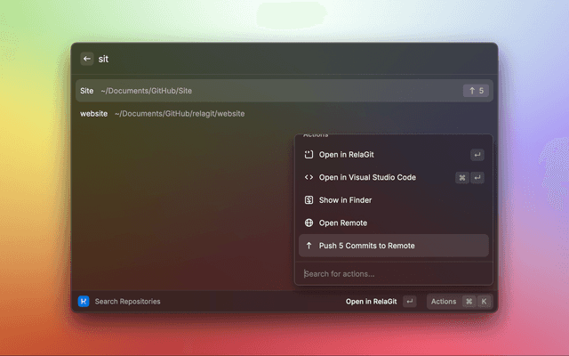 The RelaGit extension for raycast allows you to view and search your RelaGit repositories, and manage your RelaGit workflows.