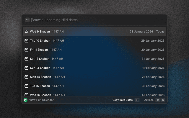 Convert dates between Hijri (Islamic) and Gregorian calendars directly from Raycast.
