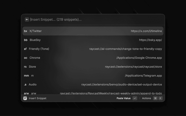 rw to open https://raycastweekly.com/, or type ,rw To insert the link to the currently open application.