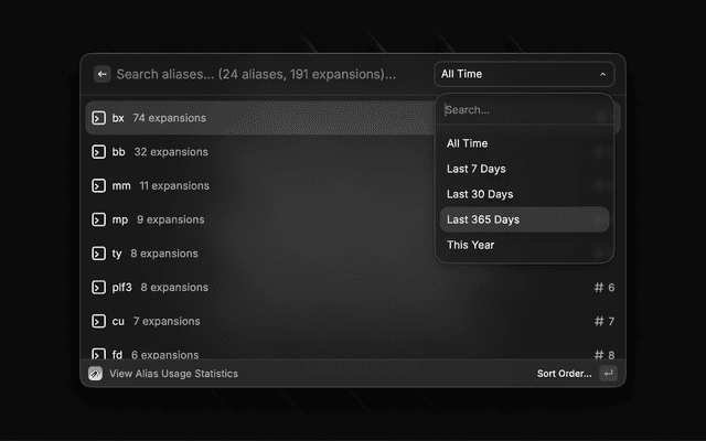 - Usage Statistics: Track how often you use each alias. View your most used aliases, total usage counts, and sort by frequency or name using the View Alias Usage Statistics command.
