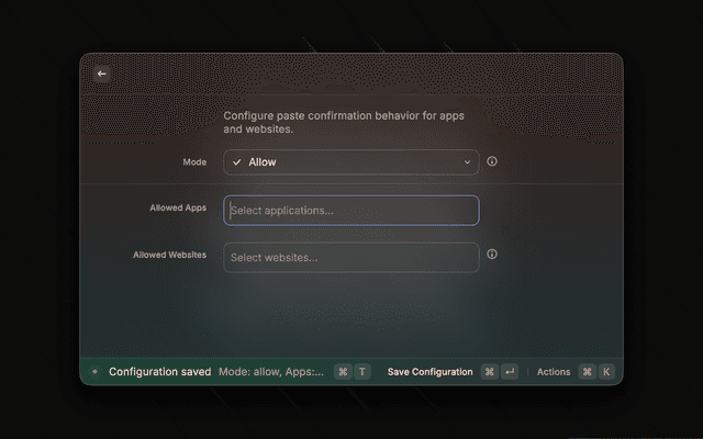 It adds context-aware confirmation before pasting, based on the frontmost app and (when available) active browser website.