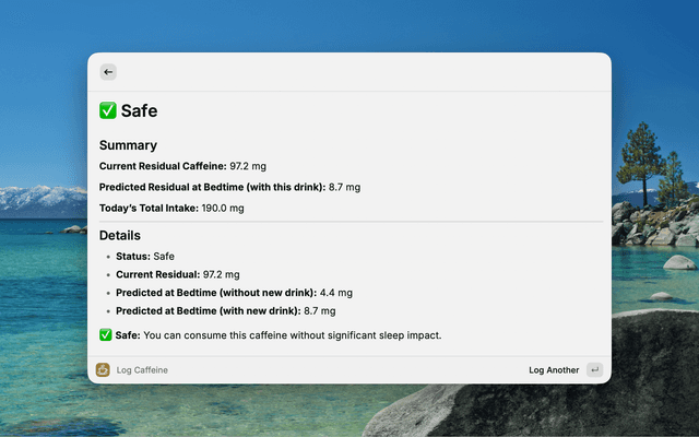 - Status Indicators - Safe, Warning, or No More Caffeine based on predicted impact