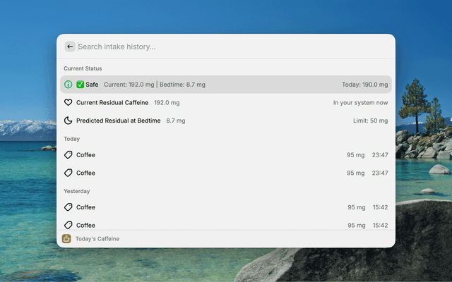 | Today's Caffeine | View history, current residual, and predicted bedtime levels |