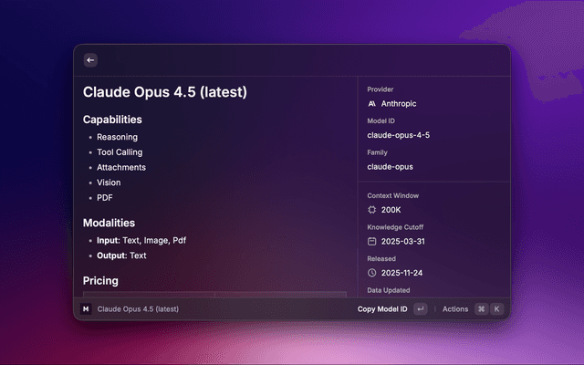 Browse AI model specifications, pricing, and capabilities from models.dev—a community-maintained database of AI models across providers.