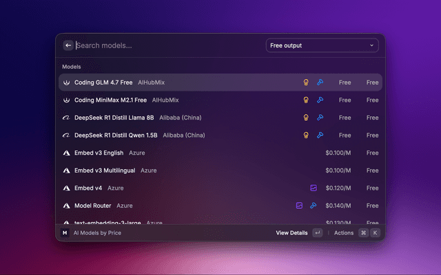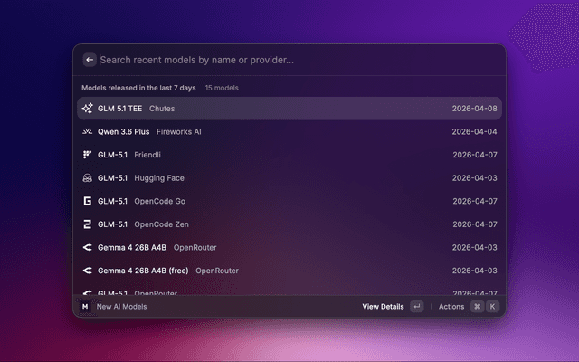 Browse models released recently. Defaults to the last 7 days; adjust the window via the lookbackPeriod preference (days) in Extension Preferences.