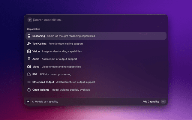 Filter models by multiple capabilities at once (e.g., reasoning + vision + tool calling).