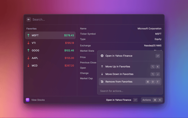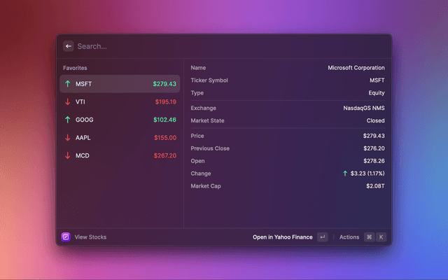 View stock market data in Raycast. Search for individual stocks by name or ticker symbol, and keep track of your portfolio by adding stocks to your list of favorites.
