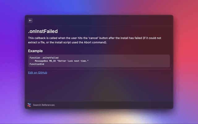 Quickly search through the documentation for Nullsoft Scriptable Install System (NSIS).