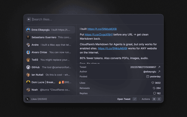 View your X/Twitter bookmarks and likes in Raycast using the bird CLI.