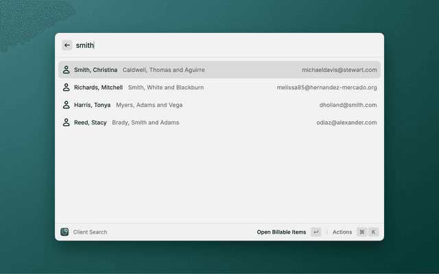 Search your WHMCS Clients and quickly access the client's profile, billable items, and more.