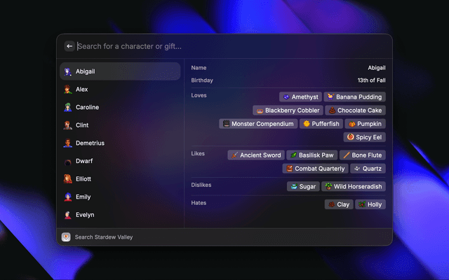This Raycast plugin helps you quickly find the best gifts for the characters in Stardew Valley. It provides an easy-to-use interface to search for characters and see what they love, like, dislike, and hate.