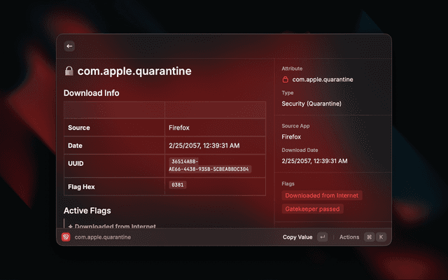 com.apple.quarantine (prompts for admin if needed)⌘O — pick another file without relaunching⌘⇧C⌘⇧X — copies the terminal equivalent to clipboardLists every extended attribute on a file in a searchable list view. Tap any attribute to see its full value — useful for understanding exactly what metadata macOS has attached to a file.