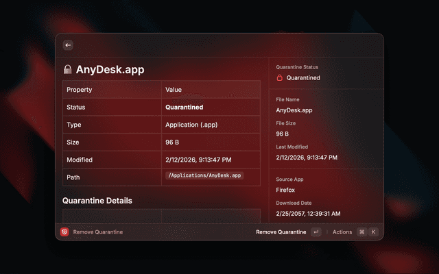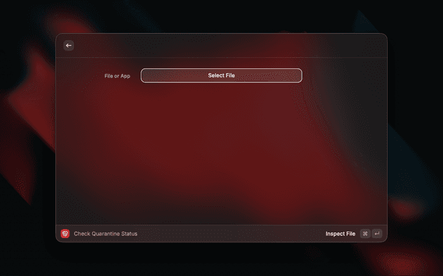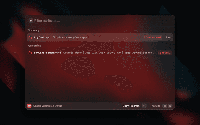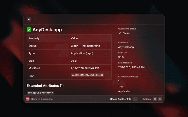 Opens a file picker (or uses your current Finder selection), then shows a full breakdown of the file's quarantine status and extended attributes. From there you can remove the quarantine flag in one action.