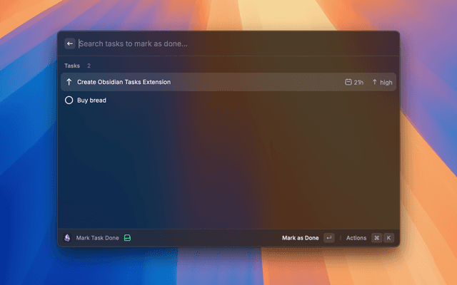 A Raycast extension to manage your Obsidian tasks from your menubar, with full support for the Obsidian Tasks Plugin format. This extension is specifically designed to work with the official Obsidian Tasks Plugin, maintaining complete compatibility with its task format and features, but it can be used without it too.