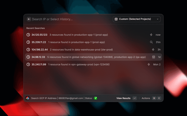 Enter - Open in GCP Console (in result view) / Configure Custom Projects (in Custom Mode Welcome view)β + Enter - Copy GCP Console URLβ + D - Toggle Details Viewβ + M - Cycle Search Modes (Quick -> Detailed -> Custom)β + Shift + P - Configure Custom Projects (Only in Custom Mode)β + X - Remove from HistoryThe extension searches for IPs in: