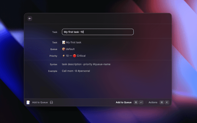 Add tasks with real-time preview showing parsed task, queue, and priority level.