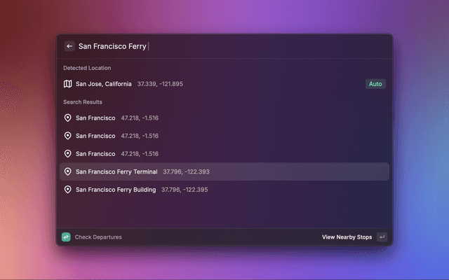 - Nearby Stops: Automatically detect your location or search for stops by name.