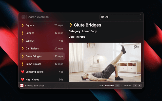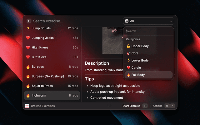 - Exercise Library: Browse 24+ exercises organized by category (upper body, core, lower body, cardio, full-body)