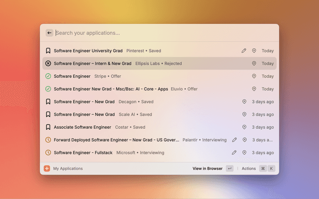 Onbo transforms the chaotic job search experience into a streamlined, keyboard-driven workflow within Raycast. Built specifically for college students and new grads entering tech, it lets you find roles and track applications without juggling tabs, spreadsheets, and bookmarks.