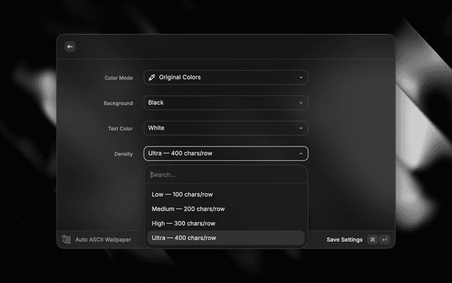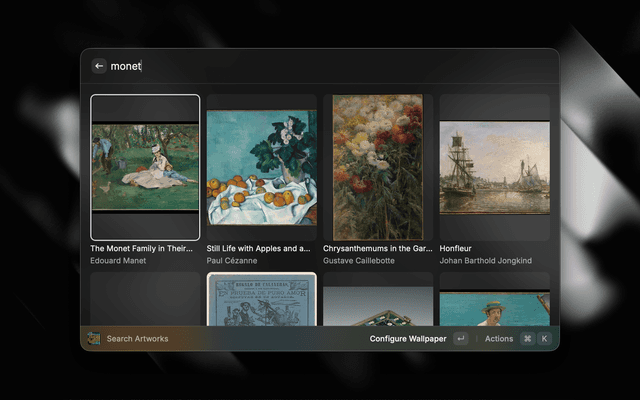 The extension fetches artwork images from the Met Museum's public API, converts them to ASCII characters using brightness mapping, and renders the result as a full-screen wallpaper image using macOS native text rendering (via sips and a compiled Swift renderer).