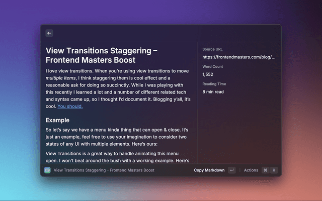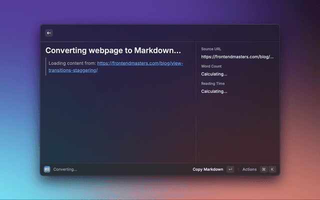 Transform any webpage into clean markdown. View directly in Raycast or copy to clipboard. Perfect for developers, note-takers and content-creators who need to save web content in markdown format.