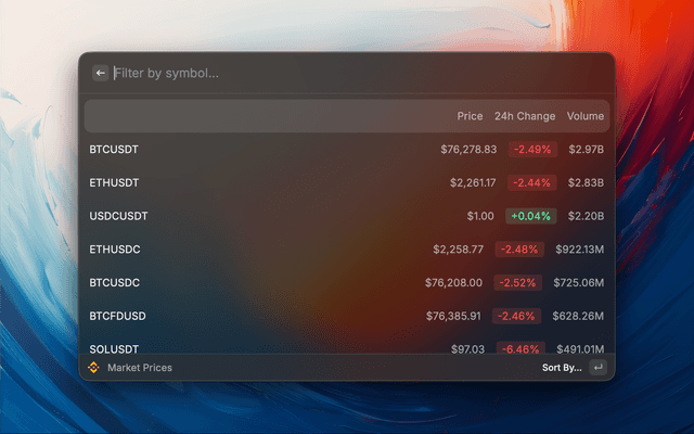 - Market Prices — Real-time prices, 24h changes, and volume for all trading pairs
