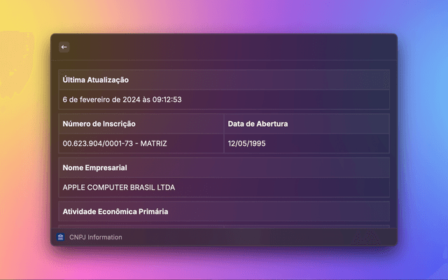 The CNPJ Lookup extension for Raycast offers a quick and efficient way to access corporate data from the Brazilian National Registry of Legal Entities (CNPJ).