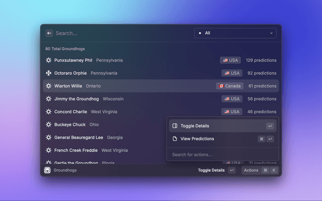 This extension uses the api at https://groundhog-day.com/ to show groundhogs and their yearly predictions.