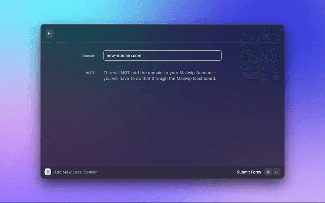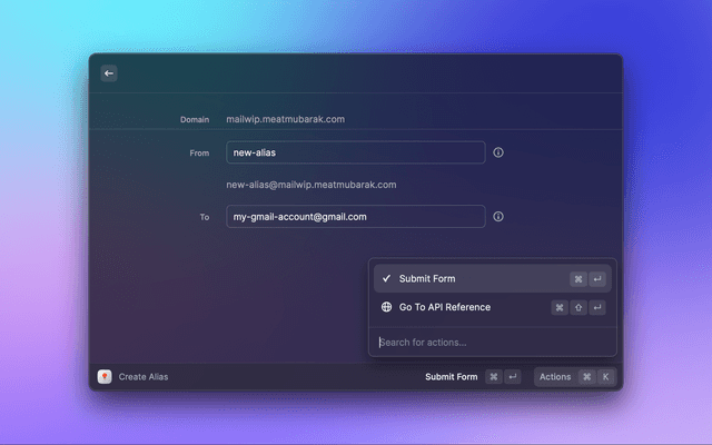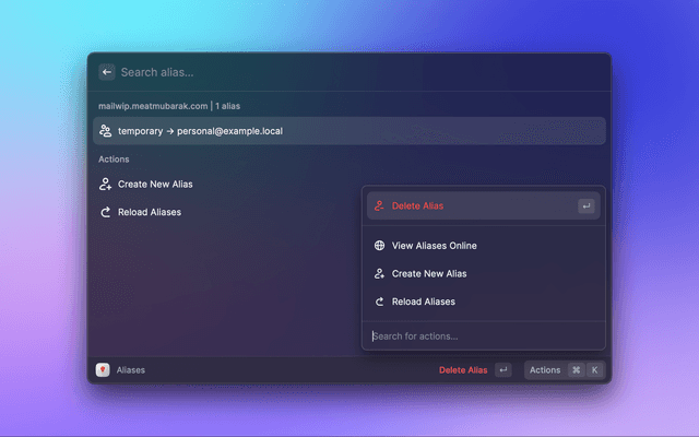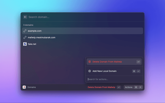 This is a Raycast extension for Mailwip (previously known as Hanami). With this extension, you can Delete Domains, Manage Aliases, and View MailLog in Mailwip.